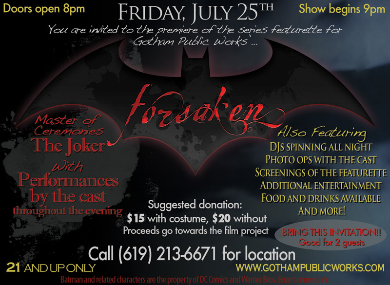 Just days away! As usual we'll have a presence at Comic-Con, suited up and ready give you some Gotham, but we've got something extra special in store this year. To start off the "Batman Forsaken" series with a bang and to help raise funds we're hosting a big premiere bash for the featurette on Friday, July 25th! We've got a lot in store for you at this party, but I'll let the flyer tell you more: